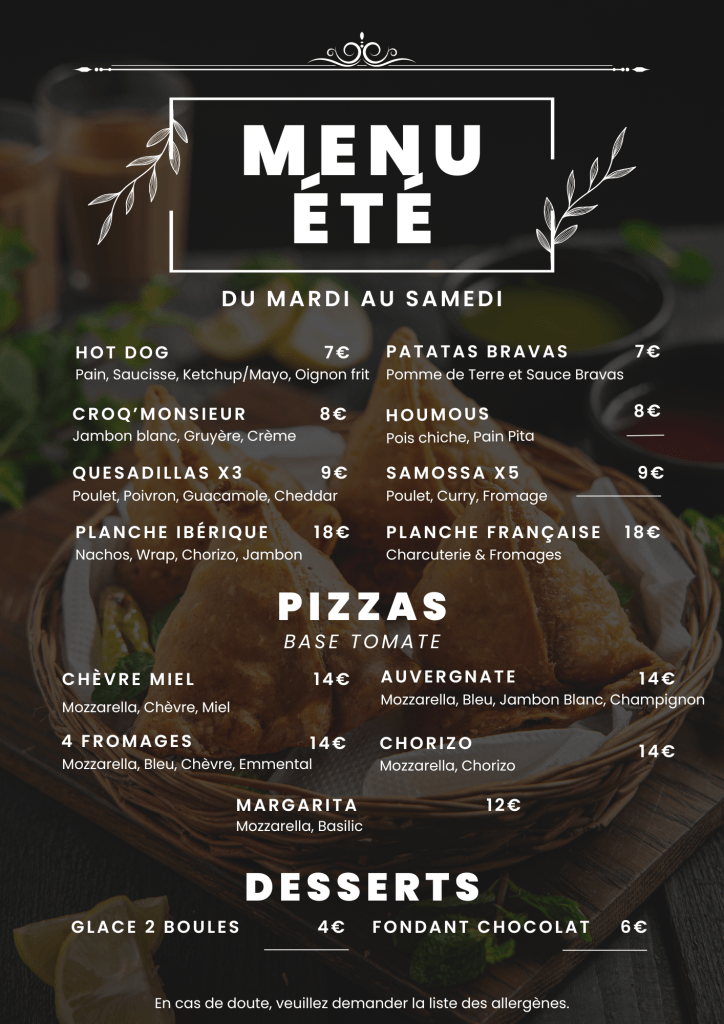 Nous vous préparons des burgers, des pizzas, des tapas et des planches comme vous n’en n’avez vu ! Laissez-vous séduire par l’alliance du fait maison avec des produits frais régionaux. Voici notre carte de l’été.